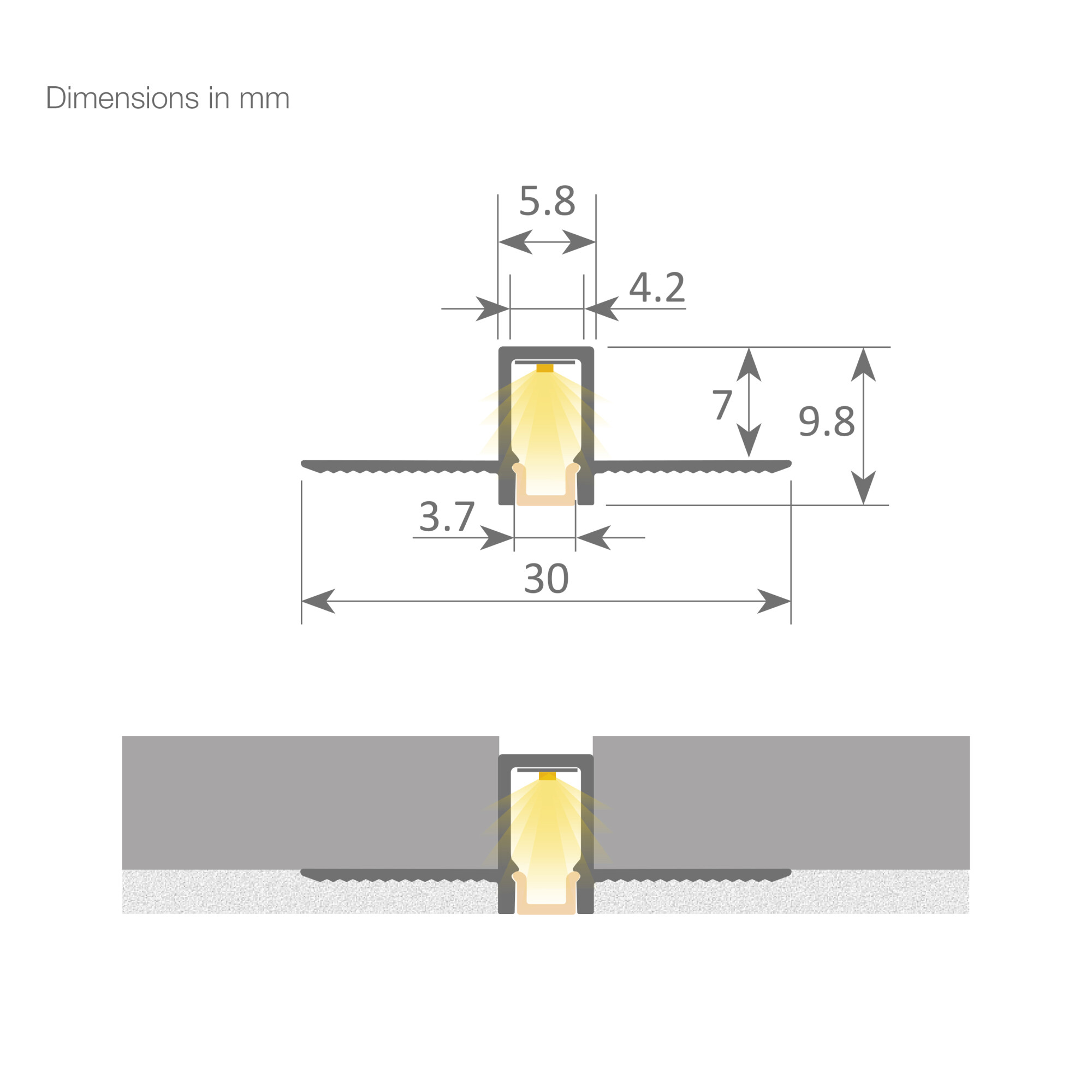 Aluminium led profile + cover for ceiling applications which remains flush with conventional plasterboard. As its light line is only 3.7mm wide, this makes it a very fine and elegant lighting option.