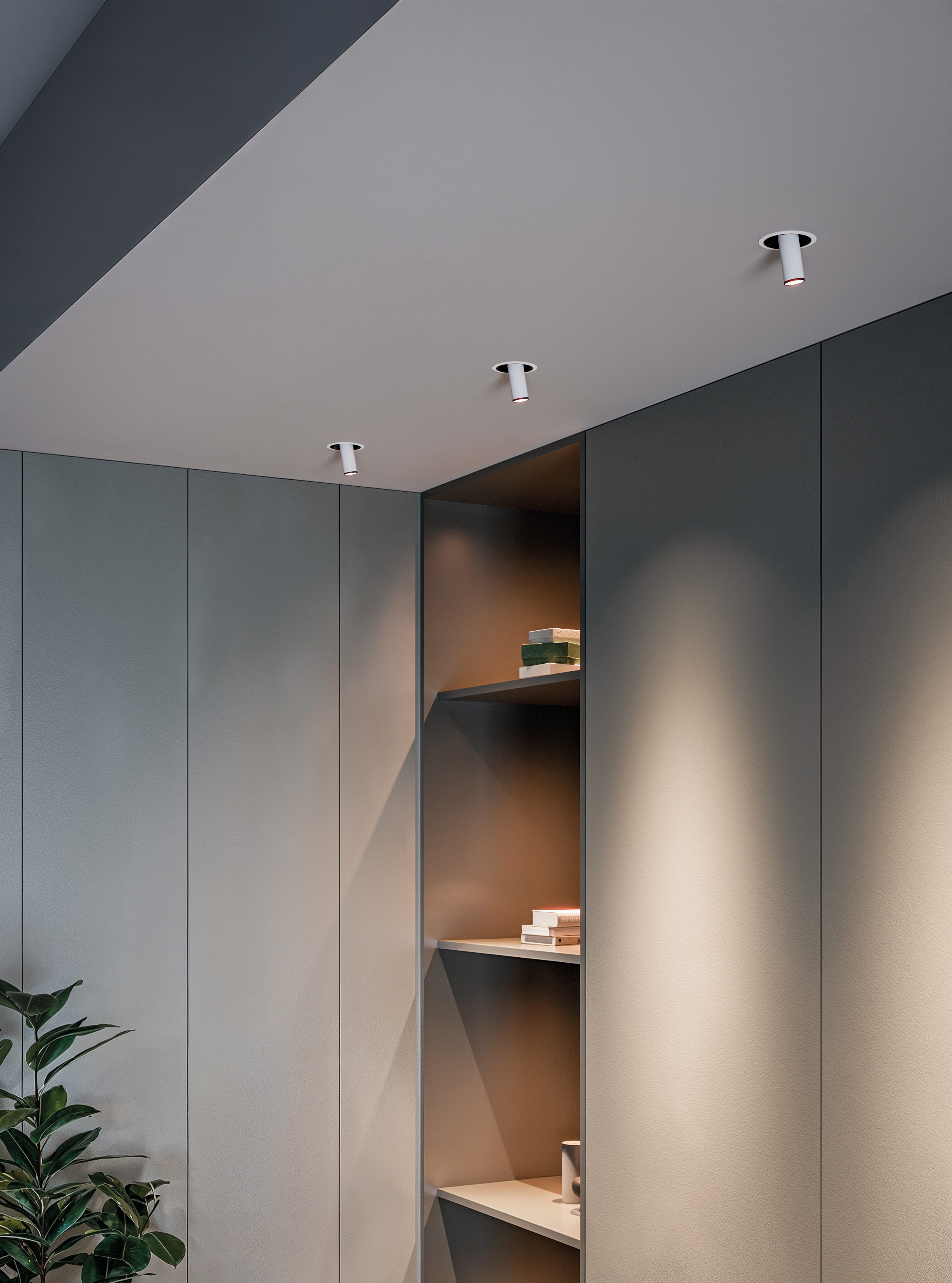 Available in recessed versions or for integration into plaster, it allows light to emerge elegantly, with zoom adjustable from within. Its adjustable tilt directs light precisely where desired.