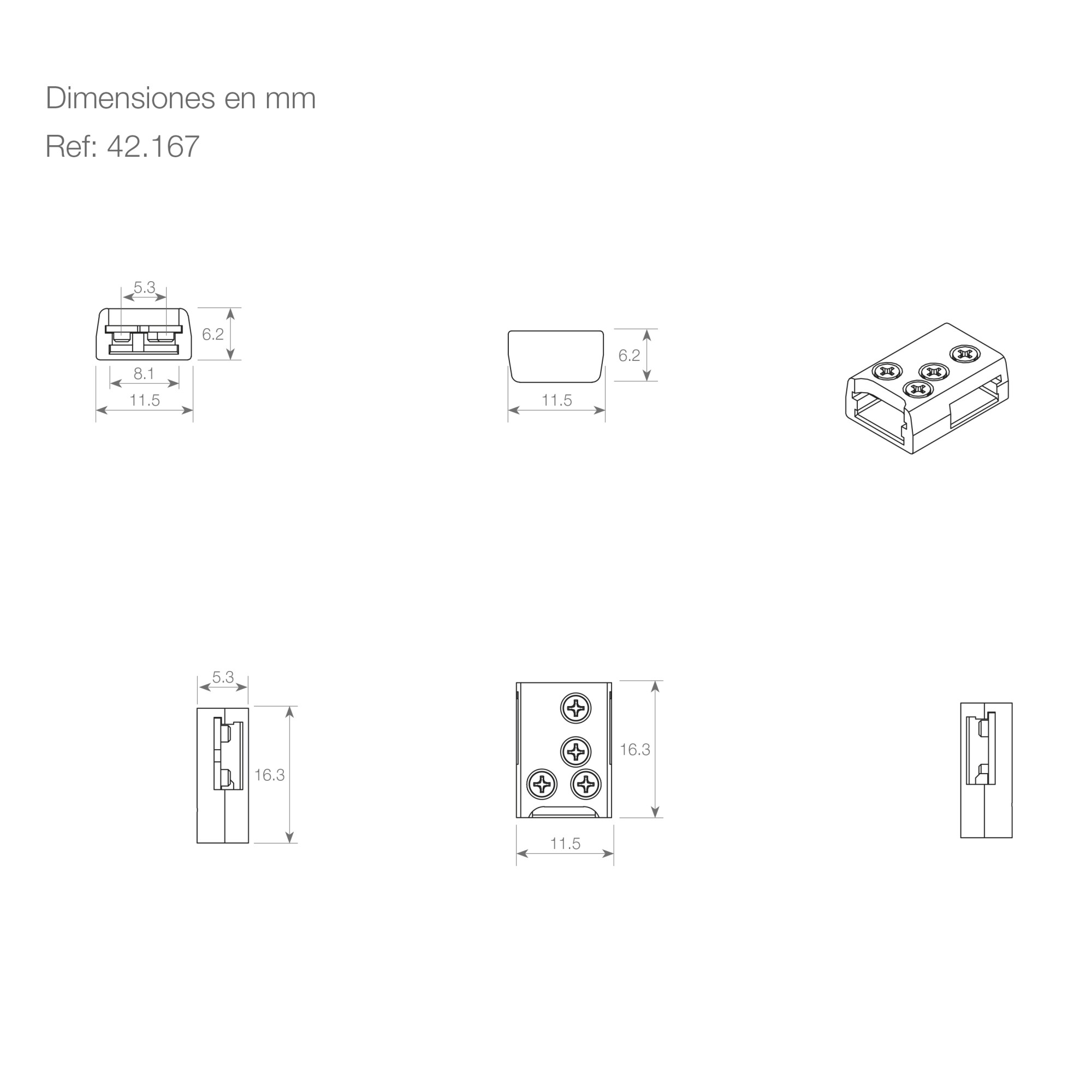 | 42.163 | CONECTOR ATORNILLABLE IP20 PARA TIRA FLEXIBLE CON PCB DE 8MM SIN CABLE (PACK DE 20 UNIDADES) | Ver precio |