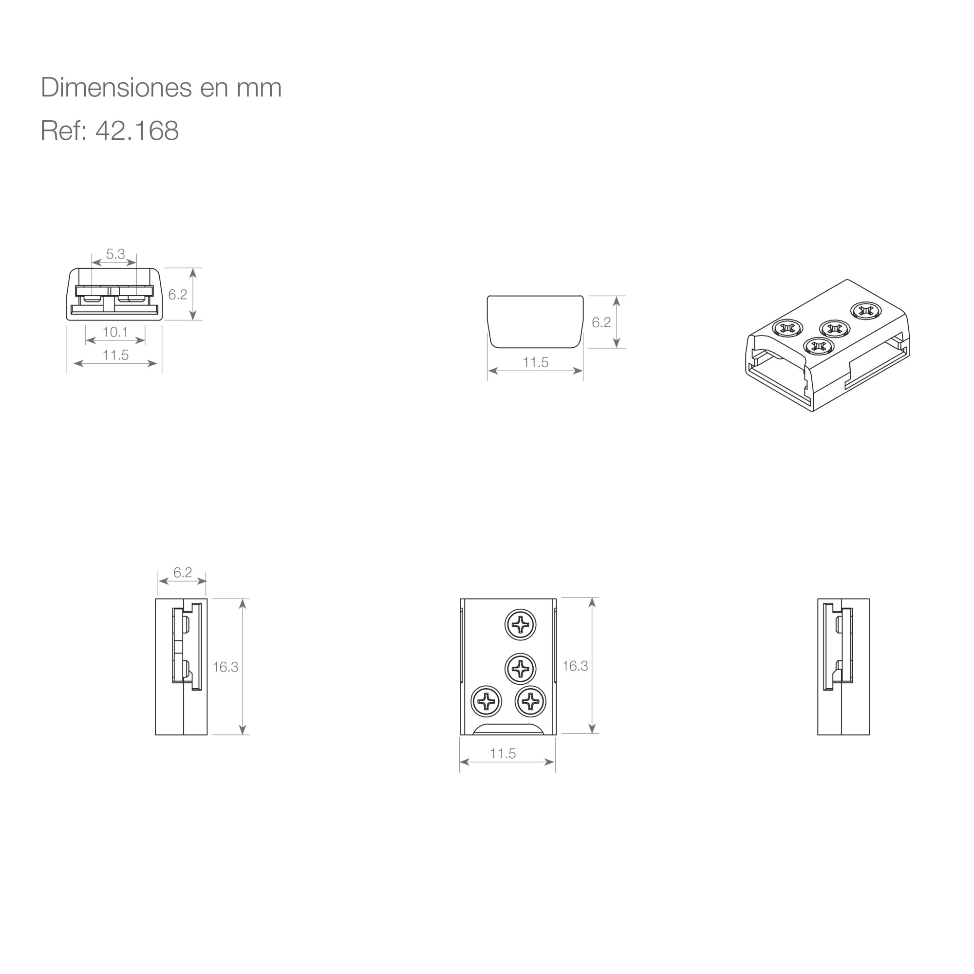 | 42.166 | UNIÓN CONECTORA ATORNILLABLE IP20 PARA TIRA FLEXIBLE CON PCB DE 10MM SIN CABLE (PACK DE 20 UNIDADES) | Ver precio |
