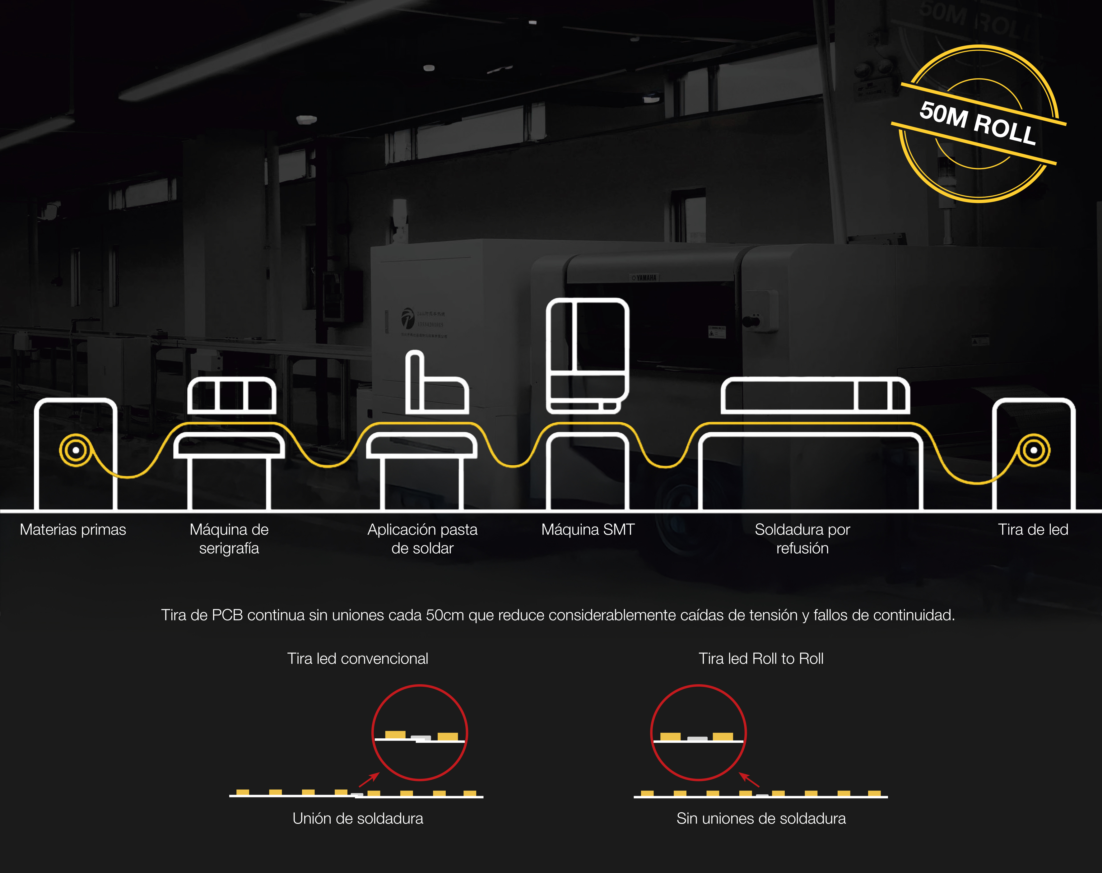 La tecnología Roll to Roll permite producir tiras de hasta 50m continuos, sin uniones, con menores caídas de tensión y 100% automatizadas.