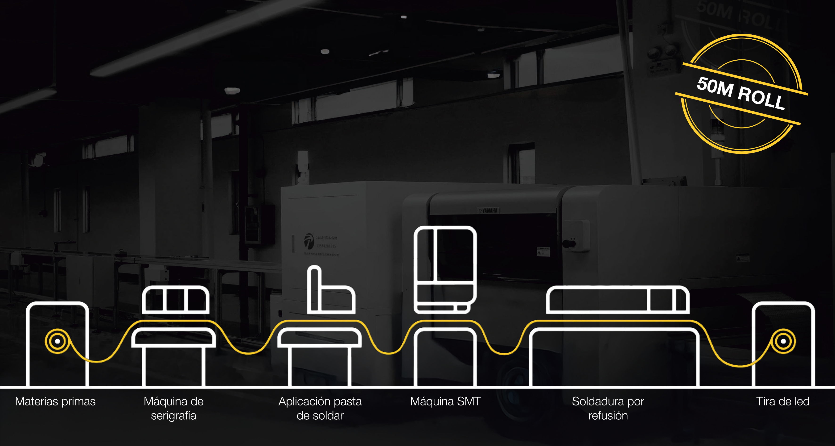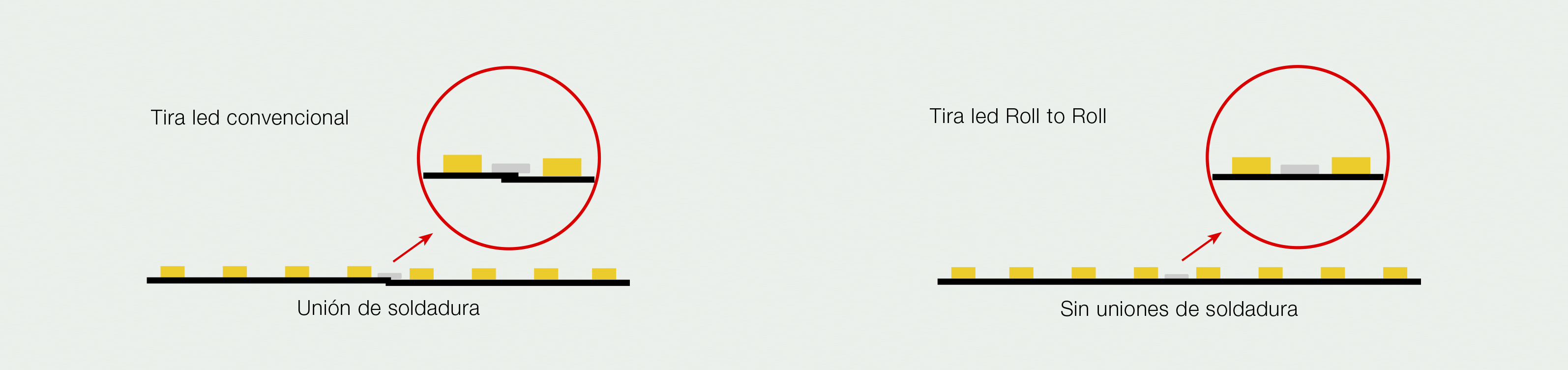 A diferencia de las tiras convencionales, producidas en tramos de 50cm que luego se ensamblan para formar rollos de 5m, el sistema Roll to Roll es un proceso automatizado que permite fabricar rollos continuos de 50m o más, sin uniones y sin intervención manual. El resultado es una tira más resistente, con menores caídas de tensión, mayor estabilidad y con un coste de producción más económico.