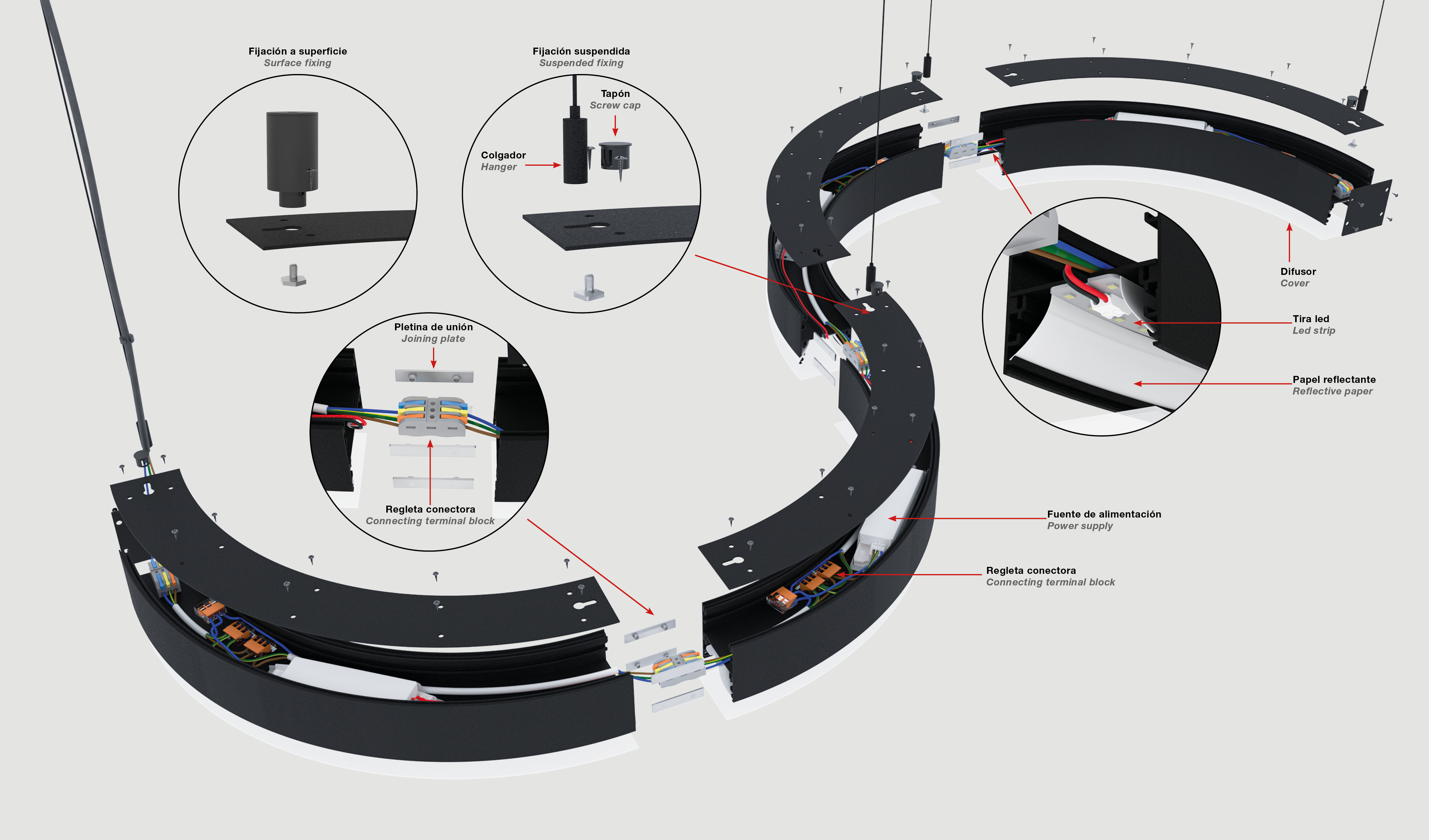 Système d'éclairage linéaire modulaire permettant de créer des luminaires sur mesure, en combinant des sections droites, courbes, des dérivations et bien plus encore. Fabriqué à partir de modules standard en stock, son montage est simple et rapide grâce à des plétines d’union et connecteurs. Cette solution garantit des livraisons quasi immédiates et la possibilité de concevoir des compositions pratiquement infinies.