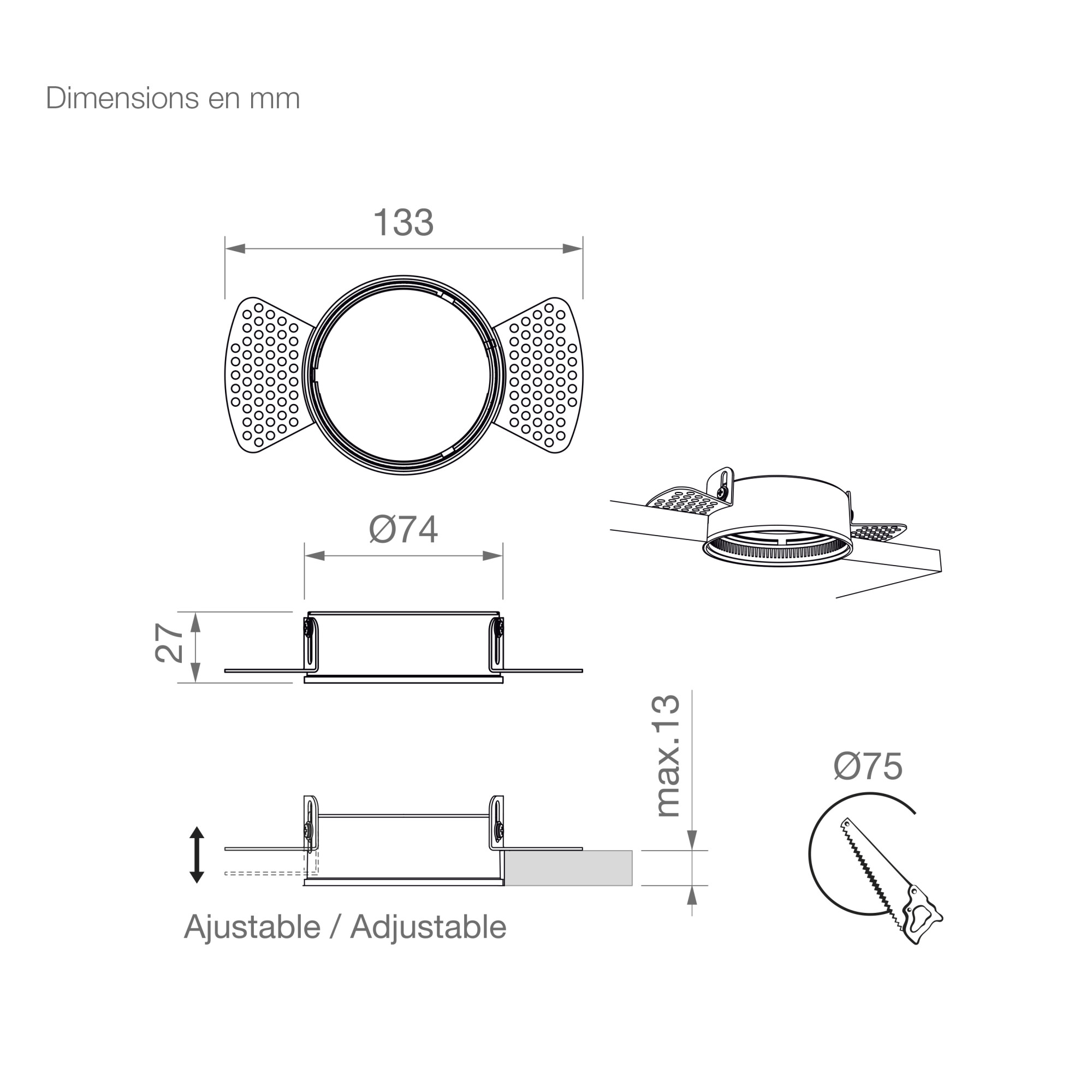 | 47.045 | CADRE ENCASTREMENT AJUSTABLE SANS BORD POUR PLAQUE DE PLÂTRE 133X27MM BLANC MAT POUR SPOTIA 14W / FOCALIS NEO, AURA, ZIA | Voir prix |