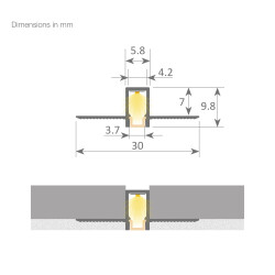 Aluminium led profile + cover for ceiling applications which remains flush with conventional plasterboard. As its light line is only 3.7mm wide, this makes it a very fine and elegant lighting option.