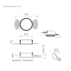 Disponible en versiones de encastre o integración en yeso, este downlight combina tres potencias (4W, 6W, 8W) y tres temperaturas de color (2700K, 3200K, 4000K).