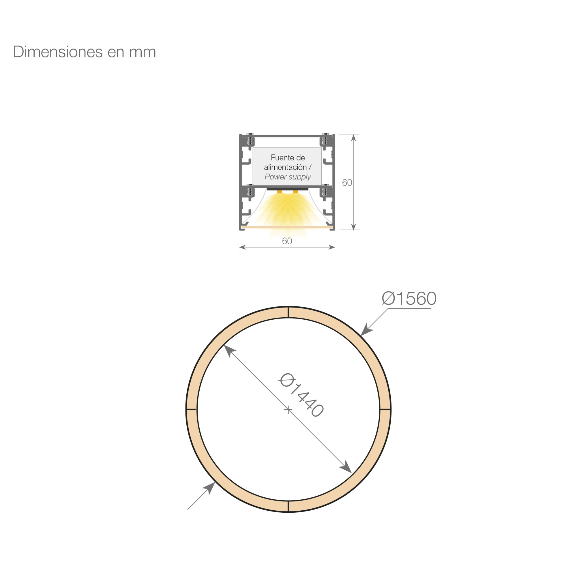 Luminaria de 156cm de diámetro en perfil de aluminio lacado en blanco texturado o lacado negro texturado con iluminación mediante tira led en 3000K - 4000K - 6000K.