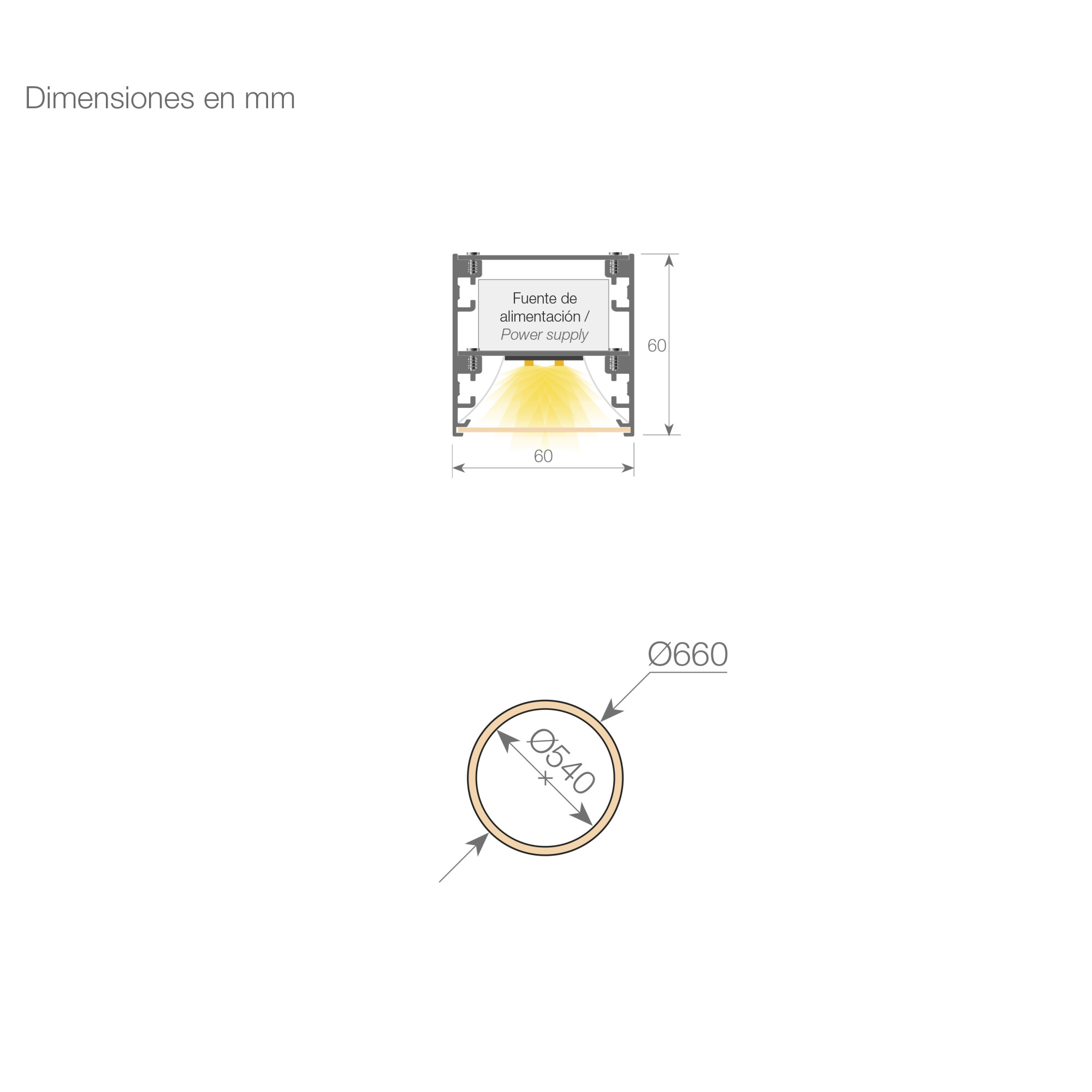 Luminaria de 66cm de diámetro fabricadas en perfil de aluminio lacado en blanco texturado o negro texturado con iluminación mediante tira led en 3000K - 4000K - 6000K.