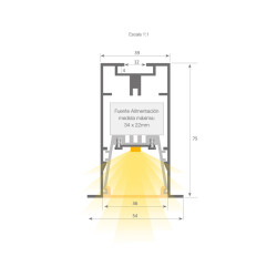 Profilo LED da incasso serie professionale, realizzato in alluminio ad alta purezza con finitura laccata testurizzata bianca e grigia. Consente l'alloggiamento interno dei driver. È dotato di un diffusore bianco satinato. Il vassoio interno permette di avvitare la striscia LED rigida da un lato e l'alimentatore dall'altro. Questo vassoio è anche rimovibile frontalmente, facilitando la manutenzione. Per motivi di sicurezza, si consiglia di fissare un cavo intrecciato dalla base del profilo al vassoio del dissipatore di calore. Profilo e diffusore sono disponibili in lunghezze di 3,4 metri.