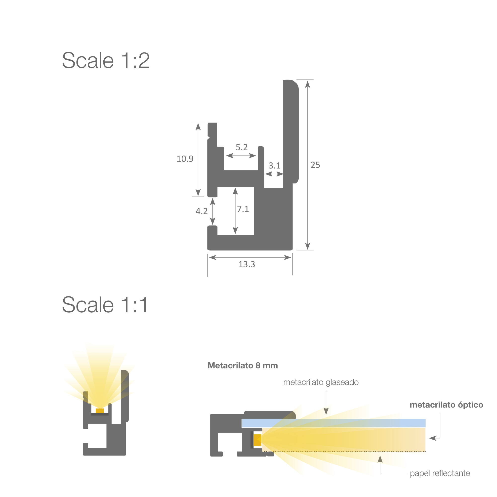 Profilo LED professionale, realizzato in alluminio anodizzato ad alta purezza nei colori argento e bianco. Ideale per la creazione di pannelli luminosi estremamente sottili per soffitti o display pubblicitari. Si consiglia l'utilizzo con le strisce LED EcoLED Granada.