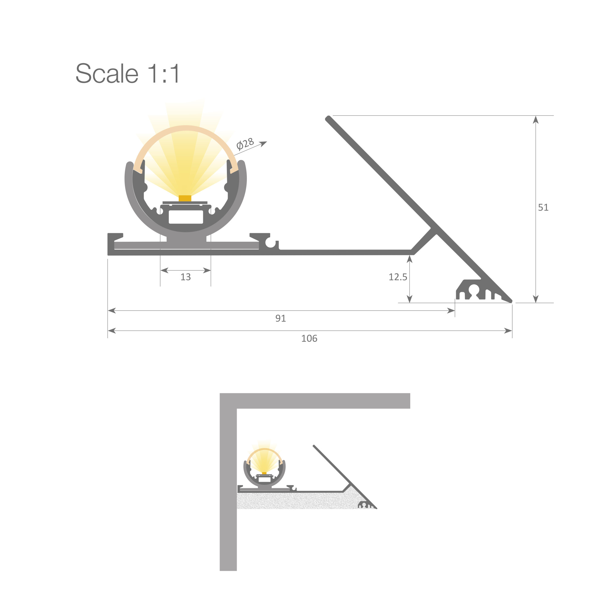 Profilo LED in alluminio con base regolabile e diffusore, progettato per illuminare il perimetro del soffitto in ambienti con luce diffusa e ambientale. Deve essere montato su una cornice o superficie simile. La sua finitura diagonale garantisce un'illuminazione completamente indiretta.