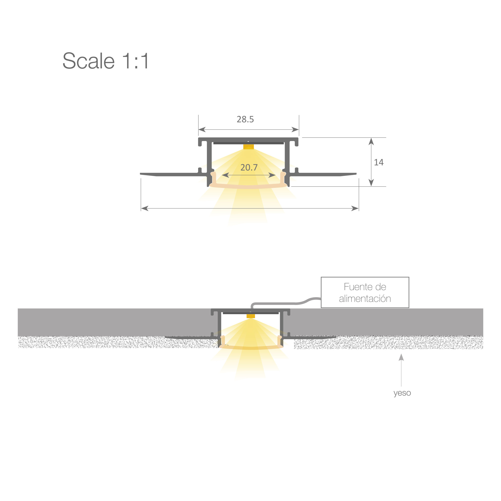 Led profile serie PROFESSIONALE realizzato in alluminio ad alta purezza disponibile in anodizzato argento. Profilo ideale per l’illuminazione di soffitti e pareti, dove si integra coprendo le alette con il gesso. Dispone di due alette forate che facilitano l’inserimento del gesso, garantendo così una perfetta adesione. Si consiglia l’applicazione di una rete che rinforzi l’unione per evitare future crepe. Adatto per strisce LED con una larghezza massima di 20 mm e una potenza non superiore a 30W/m. Si consiglia l’uso di strisce ecoled Canovelles-Barcelona-Gomera-COB per ottenere un’illuminazione più omogenea e diffusa. Permette anche l’illuminazione tramite strisce LED rigide.