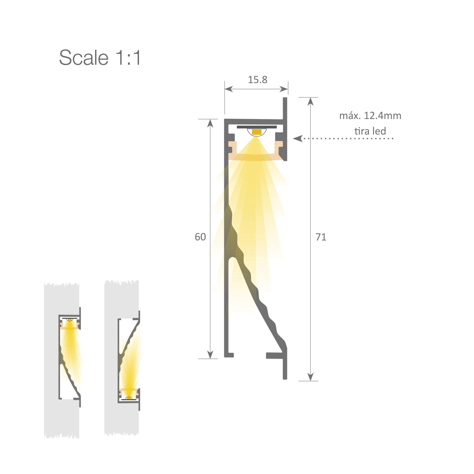 Profilo LED serie BASIC, realizzato in alluminio ad alta purezza, disponibile nelle finiture anodizzato argento e laccato bianco. Questo profilo è ideale per l'illuminazione indiretta di pareti e corridoi. Può essere integrato in pareti, cartongesso o pannelli in legno, fornendo un'illuminazione indiretta verso l'alto o verso il basso. Adatto per strisce LED con larghezza massima di 12 mm e consumo energetico non superiore a 20 W/m. Si consiglia l'utilizzo di strisce COB-Elite ecoled per un'illuminazione più omogenea e diffusa.