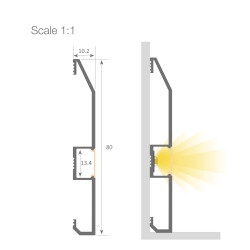 Profilo LED serie PROFESSIONALE da battiscopa in profilo di alluminio verniciato bianco. Fornito in barre da 2 metri e consente di alloggiare al suo interno strisce LED fino a 13 mm di PCB e una potenza non superiore a 20 W/m. Raccomandiamo l'uso di strisce ecoled COB per una corretta diffusione del punto LED e un grado di impermeabilità ottimale. Si fissa alla parete con silicone convenzionale.