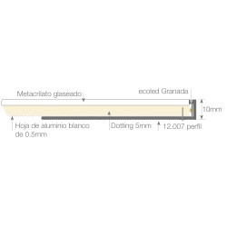 Pannelli ultrasottili illuminati con metacrilato ottico "a puntini" da 5 mm di spessore + pannello in metacrilato bianco satinato da 3 mm di spessore, illuminati da un lato con una striscia LED flessibile ad alta luminosità.