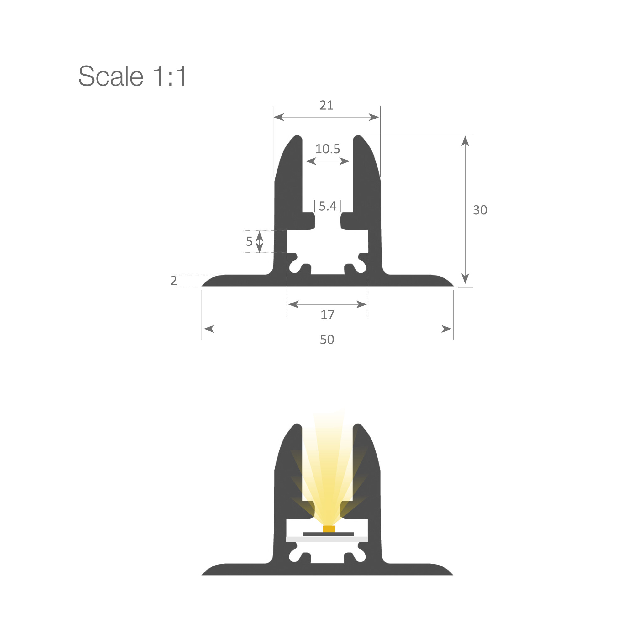 Profilo LED professionale in alluminio anodizzato argento ad alta purezza. Questo profilo multifunzionale consente la realizzazione di insegne a parete o da tavolo utilizzando metacrilato inciso (insegne con filtro luminoso). Può essere utilizzato anche come mensola illuminata con metacrilato o vetro. Adatto per strisce LED con larghezza massima di 15 mm e consumo energetico non superiore a 20 W/m. Si consiglia l'utilizzo di strisce Ecoled Ávila per ottenere un'illuminazione bianca o colorata.
