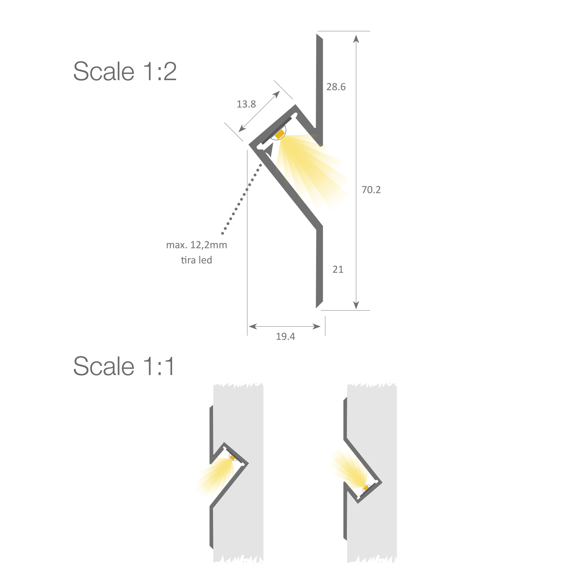 Led profile serie BASIC senza diffusore realizzato in alluminio ad alta purezza disponibile in anodizzato argento. Profilo ideale per l’illuminazione indiretta di pareti e corridoi. Consente l’integrazione tra la parete, il cartongesso o i pannelli in legno, illuminando in modo indiretto verso l’alto o verso il basso. Adatto per strisce LED con una larghezza massima di 12 mm e una potenza non superiore a 20W/m. Si consiglia l’uso di strisce ecoled Canovelles-Barcelona-Gomera-COB per ottenere un’illuminazione più omogenea e diffusa.