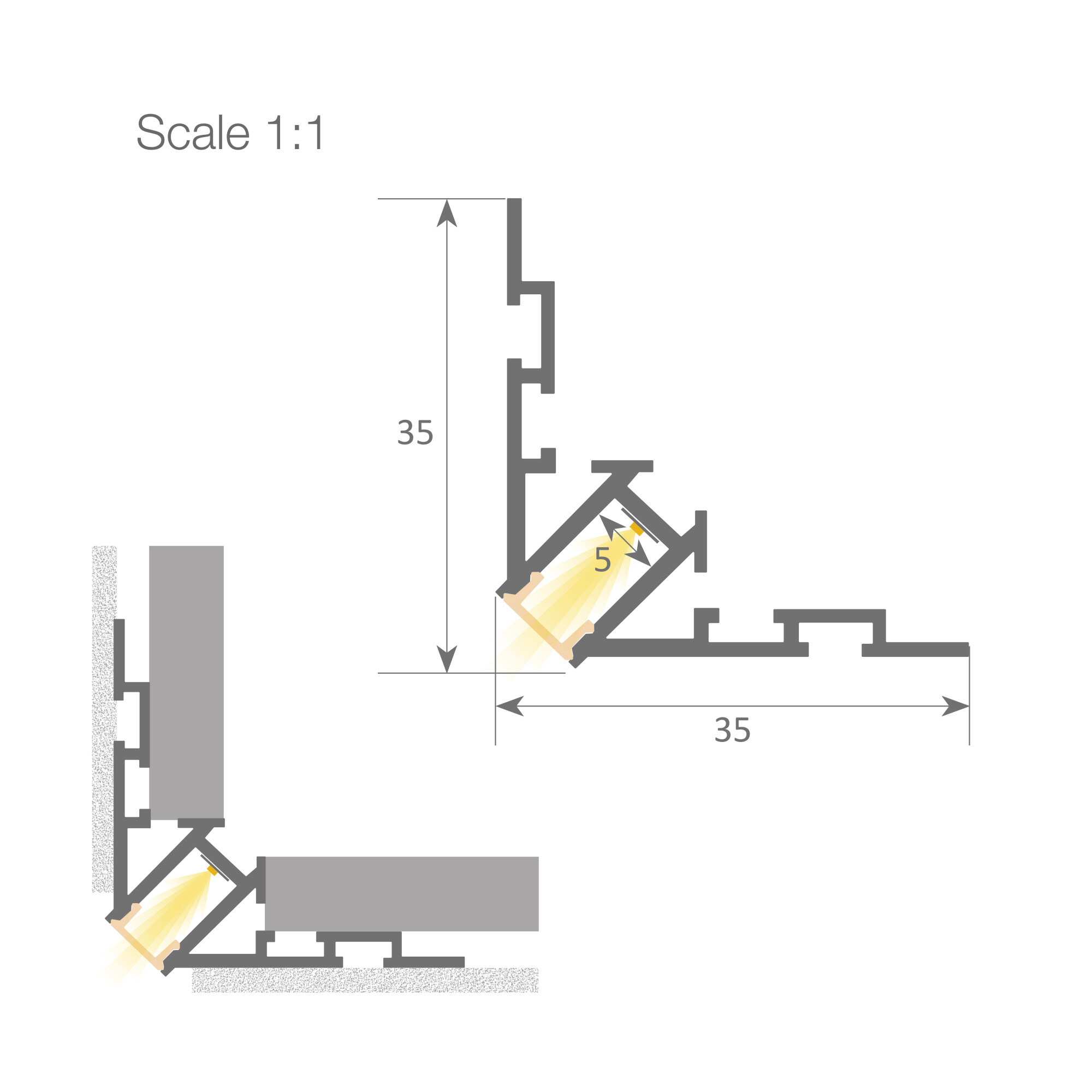 Profilo LED in alluminio + diffusore angolare architettonico per integrazione a parete. Rifinito con uno strato di intonaco, si integra perfettamente nella parete.