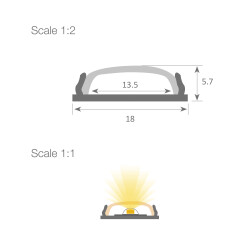 profilo LED serie PROFESSIONALE da superficie, realizzato in alluminio ad alta purezza anodizzato in argento e verniciato bianco (su richiesta disponibile in verniciature/anodizzazioni diverse). Profilo multifunzionale ideale per applicazioni a superficie, come luminaria sospesa, o altre applicazioni dove sia necessario un profilo con una certa flessibilità per adattarsi a curve e forme irregolari. Raggio minimo di curvatura di Ø22cm. Adatto per strisce LED con una larghezza massima di 13 mm e una potenza non superiore a 20 W/m. Raccomandiamo l'uso delle strisce ecoled Cíes-Barcelona per ottenere un'illuminazione omogenea senza visibilità del punto.