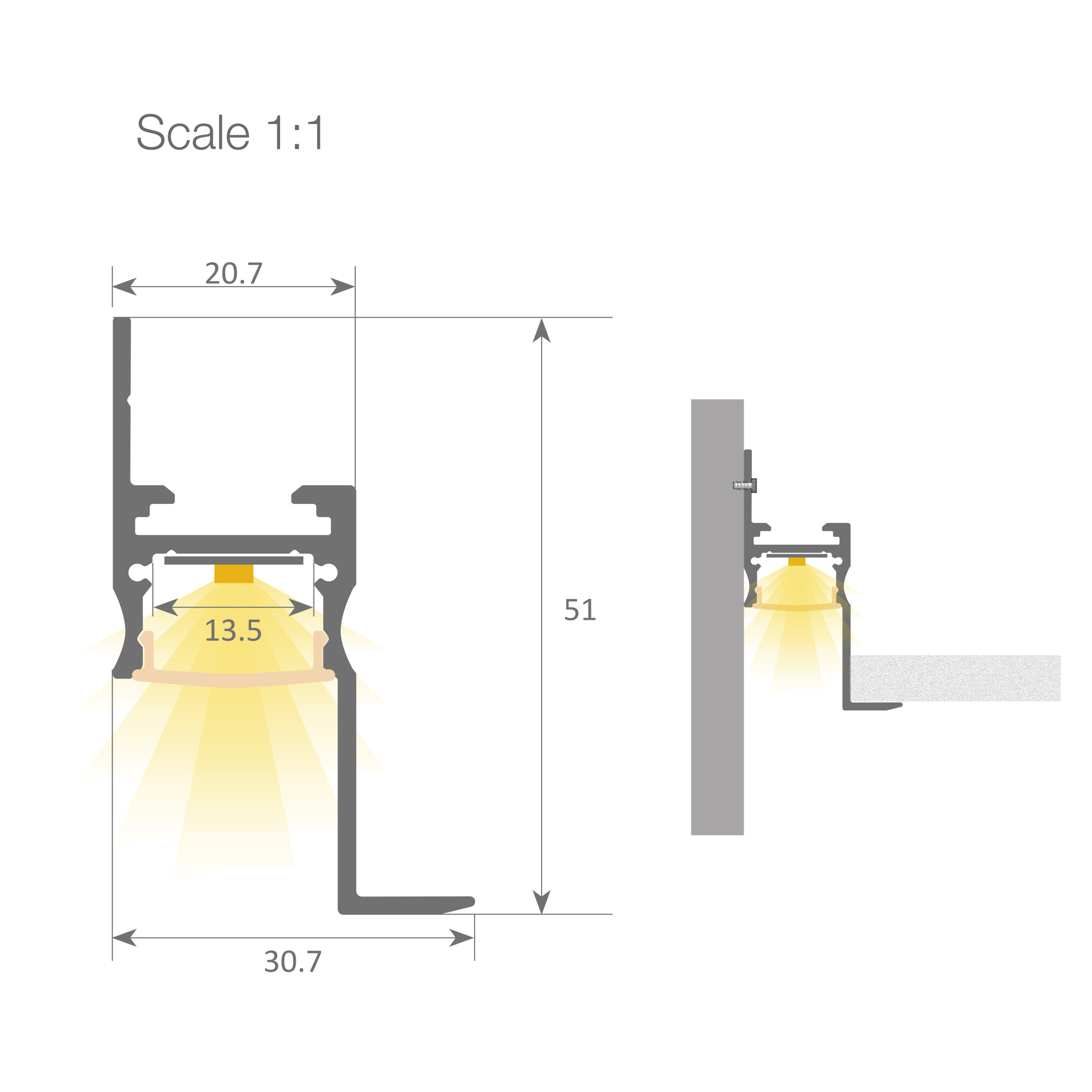 Profilo LED in alluminio con diffusore, progettato per l'illuminazione perimetrale del soffitto in ambienti con luce diffusa e ambientale. Si fissa direttamente alla parete tramite viti e permette di rifinire i bordi dei pannelli per controsoffitti Armstrong o Pladur.