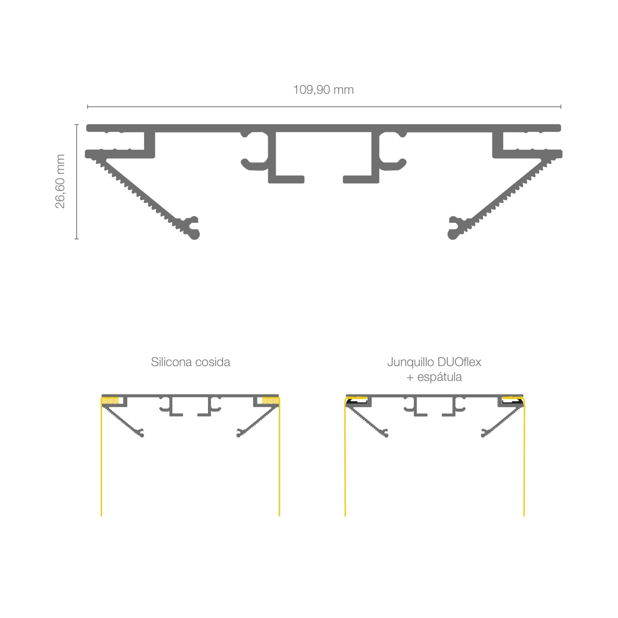 Profilo per realizzare apparecchi con 110 mm di profondità bifacciali. È progettato per essere illuminato mediante strisce rigide boxled lungo il perimetro. Viene fornito in barre da 600 o 300 cm ed è disponibile in anodizzato argento, verniciato bianco testurizzato e nero testurizzato. Consente il tensionamento con striscia in silicone o fermavetro con spatola Duoflex. Dispone di squadrette e rinforzi strutturali.