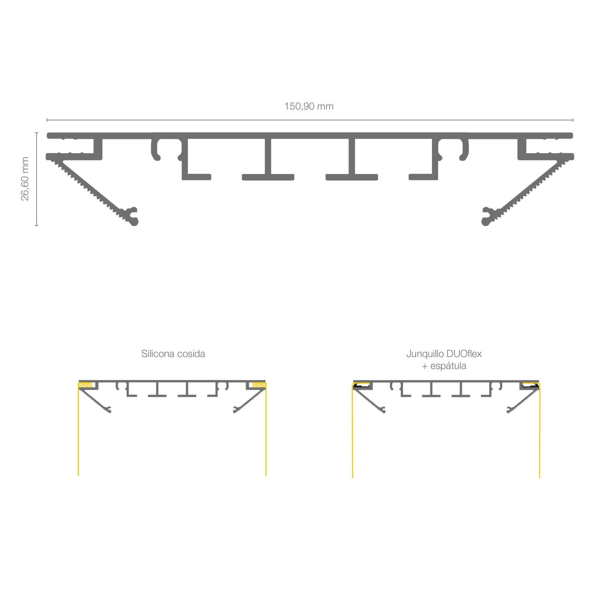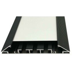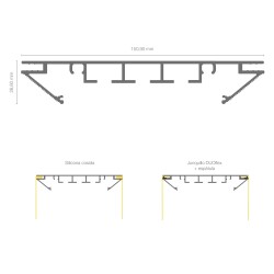 Profilo per la produzione di apparecchi di illuminazione bifacciali profondi 150 mm. Progettato per l'illuminazione perimetrale con strisce LED rigide. Disponibile in lunghezze di 600 cm o 300 cm e nelle finiture argento anodizzato, bianco testurizzato e nero testurizzato. Può essere tensionato con nastro siliconico o guarnizioni per vetri Duoflex con una spatola. Include staffe e rinforzi strutturali.